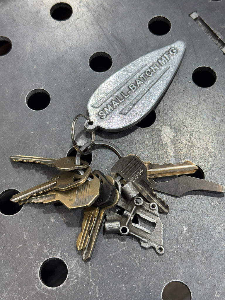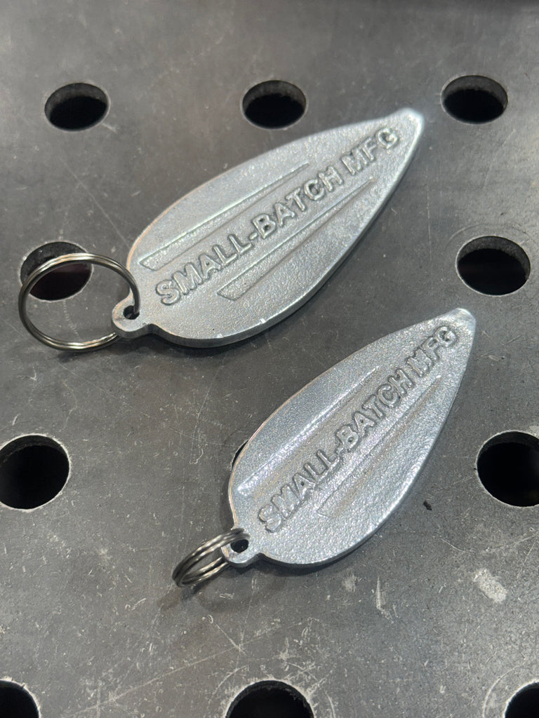 Cast aluminium key trinket, semi-polished front face and raw cast back. Key ring included.